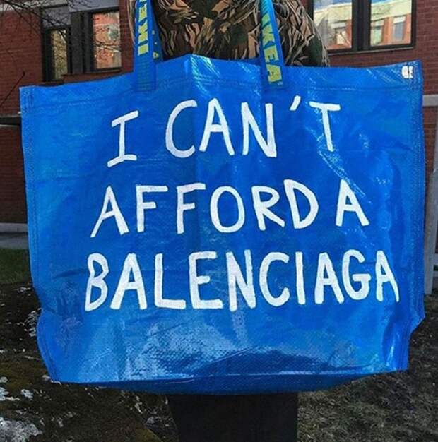 Недавно дизайнер Демна Гвасалия пополнил коллекцию аксессуаров Balenciaga объемной сумкой, по цвету и форме напоминающей пакет для покупок IKEA. Пользователи Интернета не заставили себя ждать: в сети стали размножаться мемы, иронизирующие над разницей в цене — мешок IKEA стоит 99 центов, а ее «дизайнерский вариант» — $ 2 145.