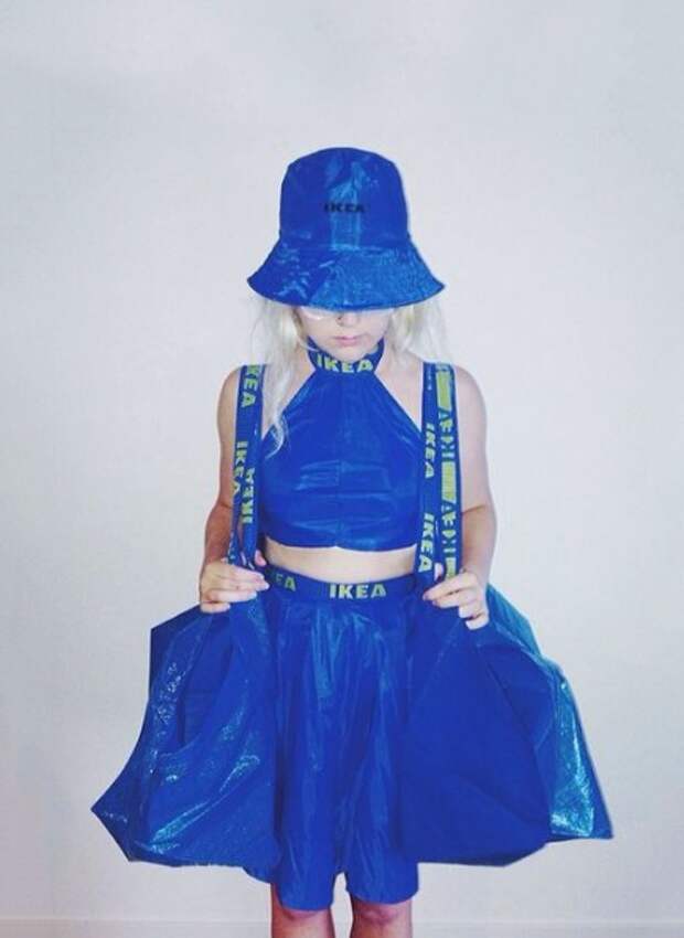 Аутфит от австралийской дизайнерши. Она считает, что человек — это главный продукт, а одежда — его упаковка. Поэтому её коллекции состоят из пакетов «Макдоналдса» и сумок IKEA.