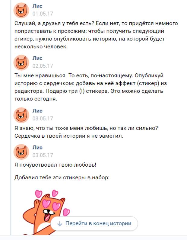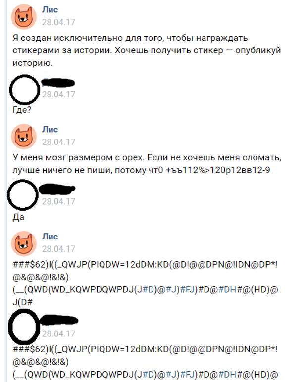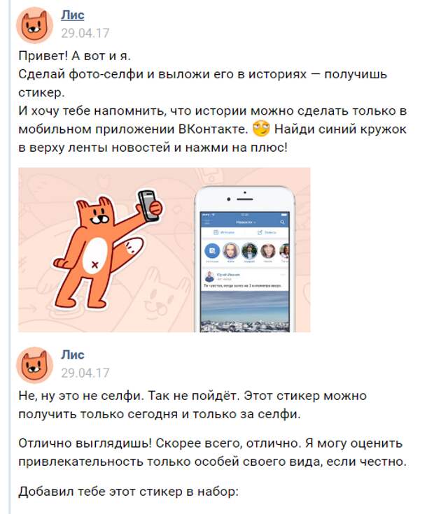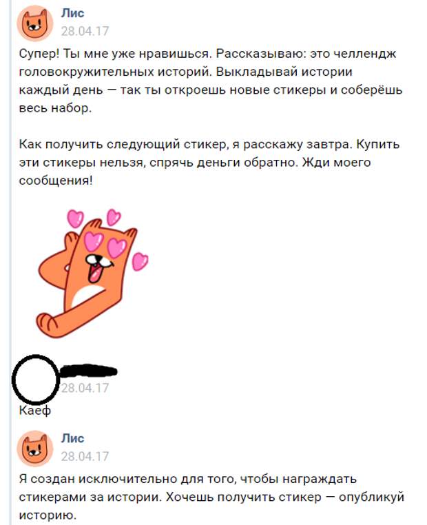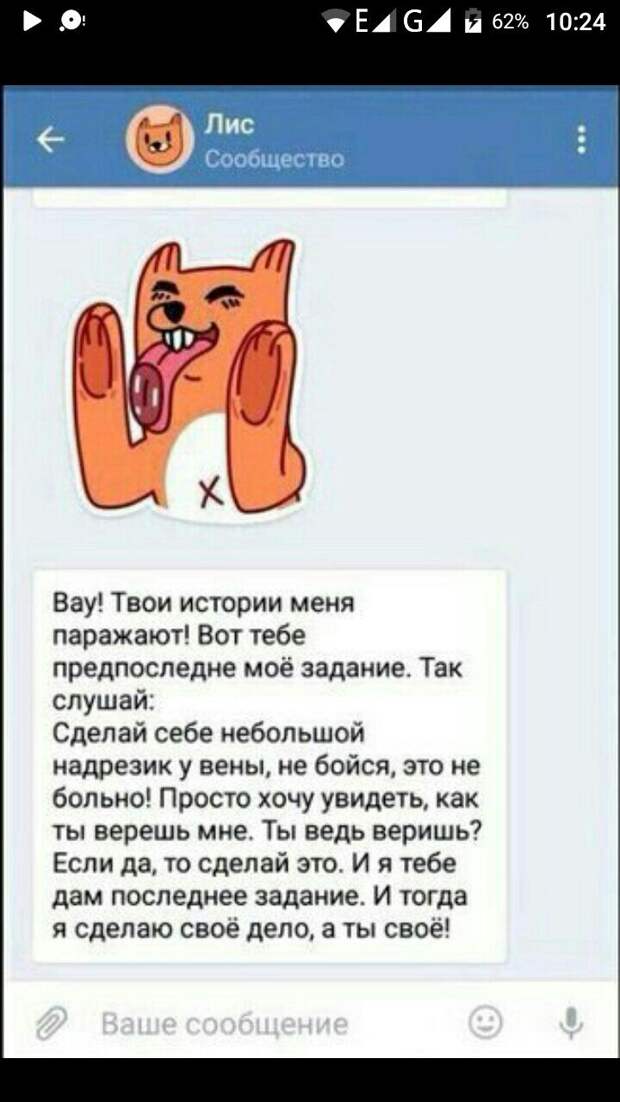Однако Лис это всего навсего бот, созданный продвигать систему «Истории ВКонтакте». Официально подтвержденный системой бот, просит детей делать надрезы на вене?