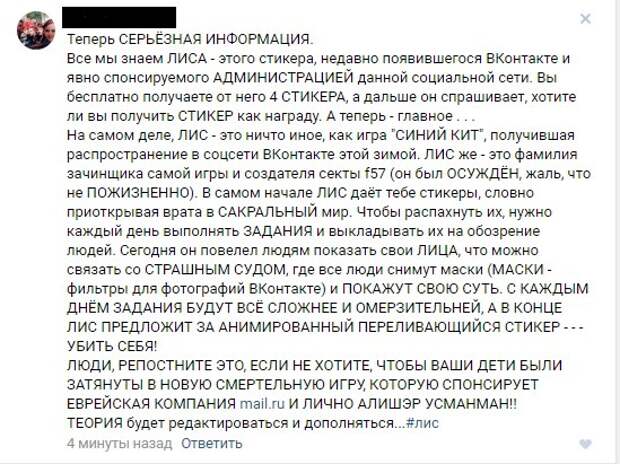 Откуда пошло начало всей этой истории?С появлением Лиса в соцсетях, начали появляться и вот такие бредовые истории. И если обычные люди просто смеялись над ними, то вот особо умные поверили каждому слову. И понеслось распространение среди групп родителей школьников в WhatsApp.