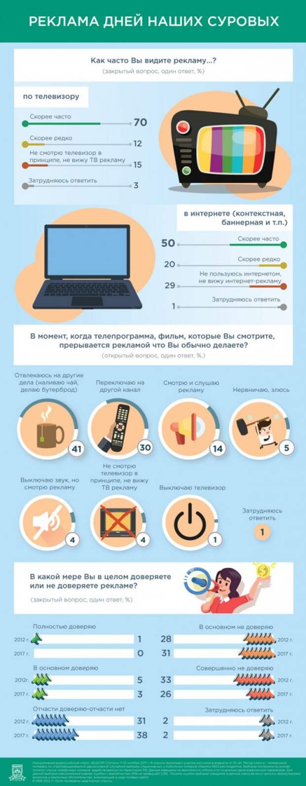 У ВЦИОМ новое исследование. На этот раз посвящено рекламе. В общем, оказалось, что многие россияне воспринимают рекламу как навязанную и не вполне соответствующую действительности информацию. Подробнее — в инфографике.