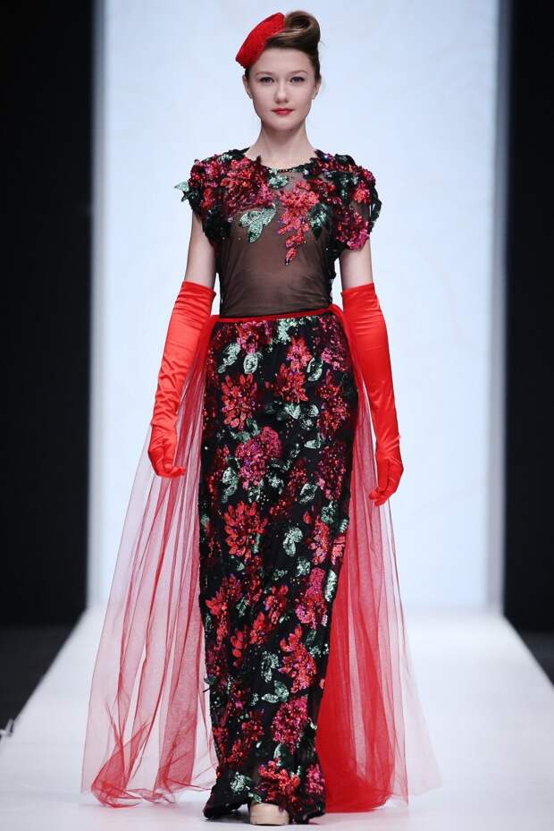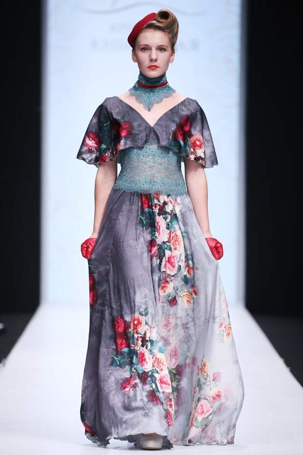 Наряды моделей выполнены из бархата, расписанного крупными винтажными розами или бархата однородных ярких тонов. Образы изысканно подчеркивают кружевные аксессуары, элегантные перчатки и миниатюрные шляпки, а удачно подобранная обувь осовременивает их и завершает.